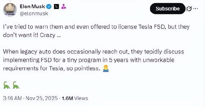 特斯拉首席执行官埃隆·马斯克近日在社交平台上抱怨称,他不明白为什么特斯拉的竞争对手不愿意使用特斯拉的自动驾驶技术。马斯克在帖子后面贴了两个“恐龙”表情符号。特斯拉的 FSD 技术可以让汽车自主执行大部分任务,但仍然需要人工监督。特斯拉长期以来一直希望将这项技术授权给其他汽车制造商,作为自动驾驶汽车商业化的一种方式。 2024 年 4 月,马斯克告诉投资者,特斯拉正在与主要汽车制造商谈判合同,并于 1 月表示,这家电动汽车巨头对支付 FSD 费用“非常感兴趣”。在 1 月份的财报电话会议上,马斯克表示:“我认为一旦我们停止使用 FSD,一切都会结束,而且我认为人们会对 FSD 许可产生很大兴趣然而,马斯克的最新帖子表明,特斯拉短期内不会就 FSD 技术许可达成重大交易。来源:新浪网